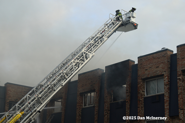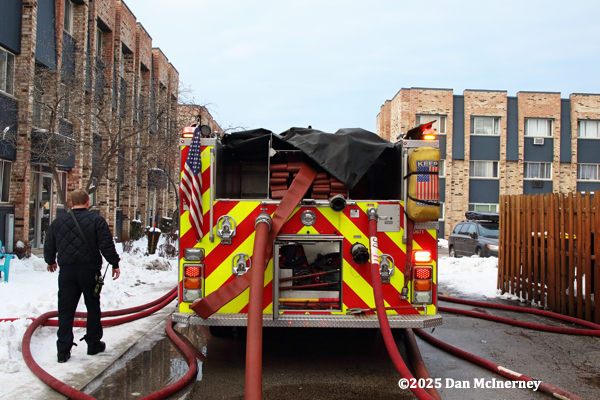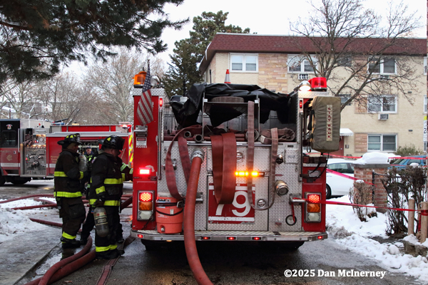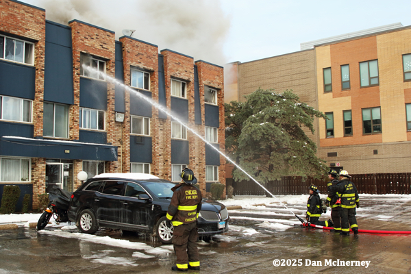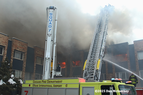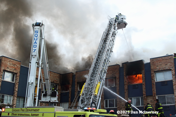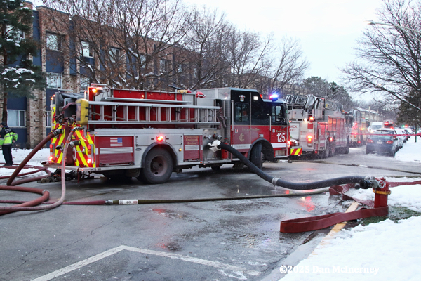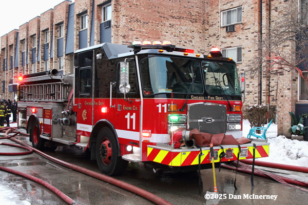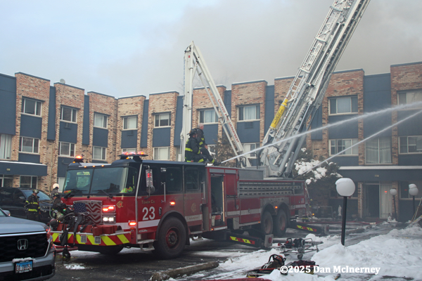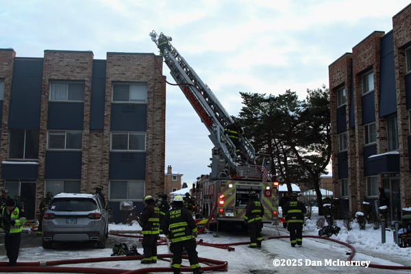 Chicago Fire Department – 2-11 Alarm of fire at 8625 W. Foster 12/5/25Fire started in a third floor apartment and spread to the cockloft. Companies were faced with water issues (lack of hydrants nearby), access issues, long leadouts, and ice.